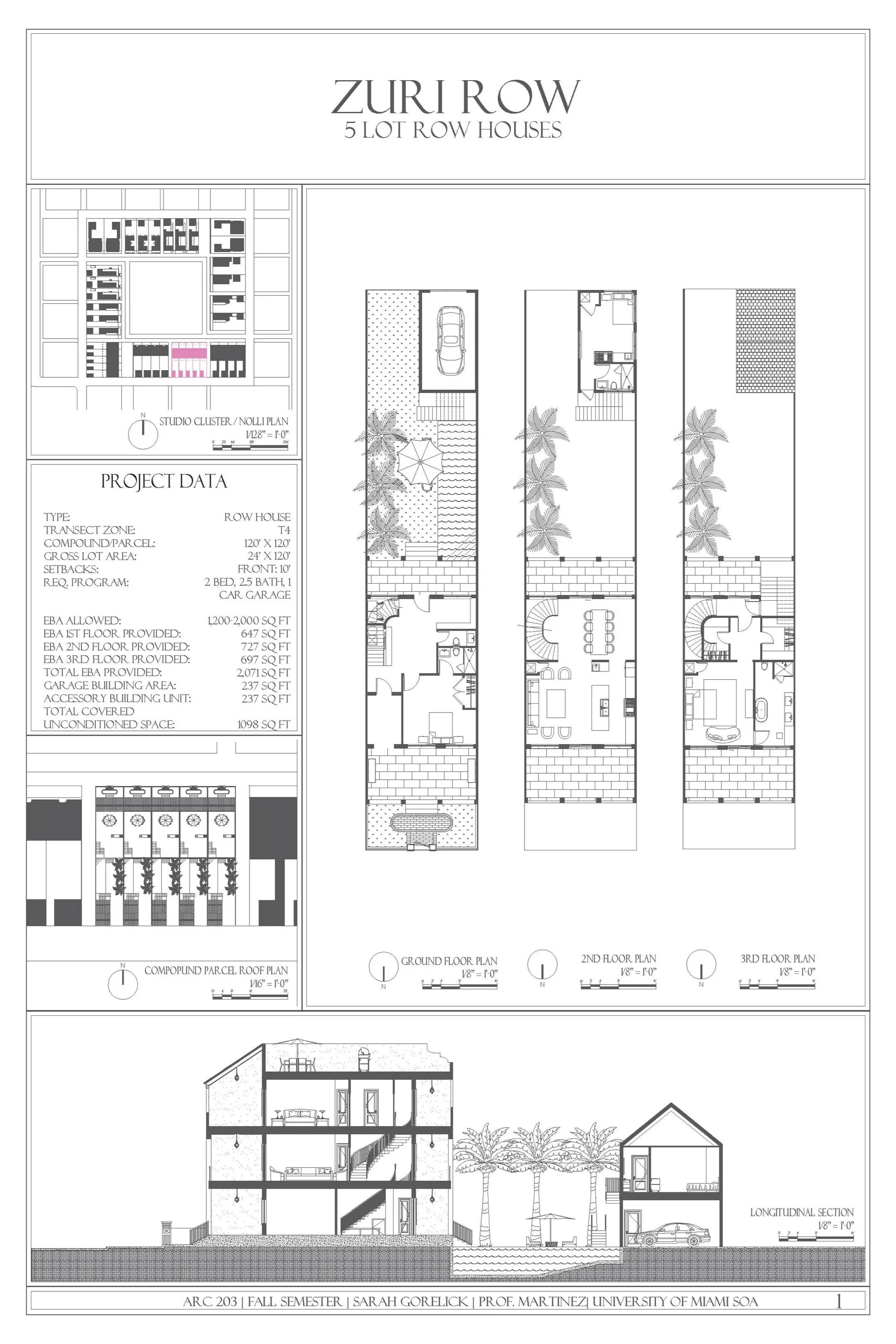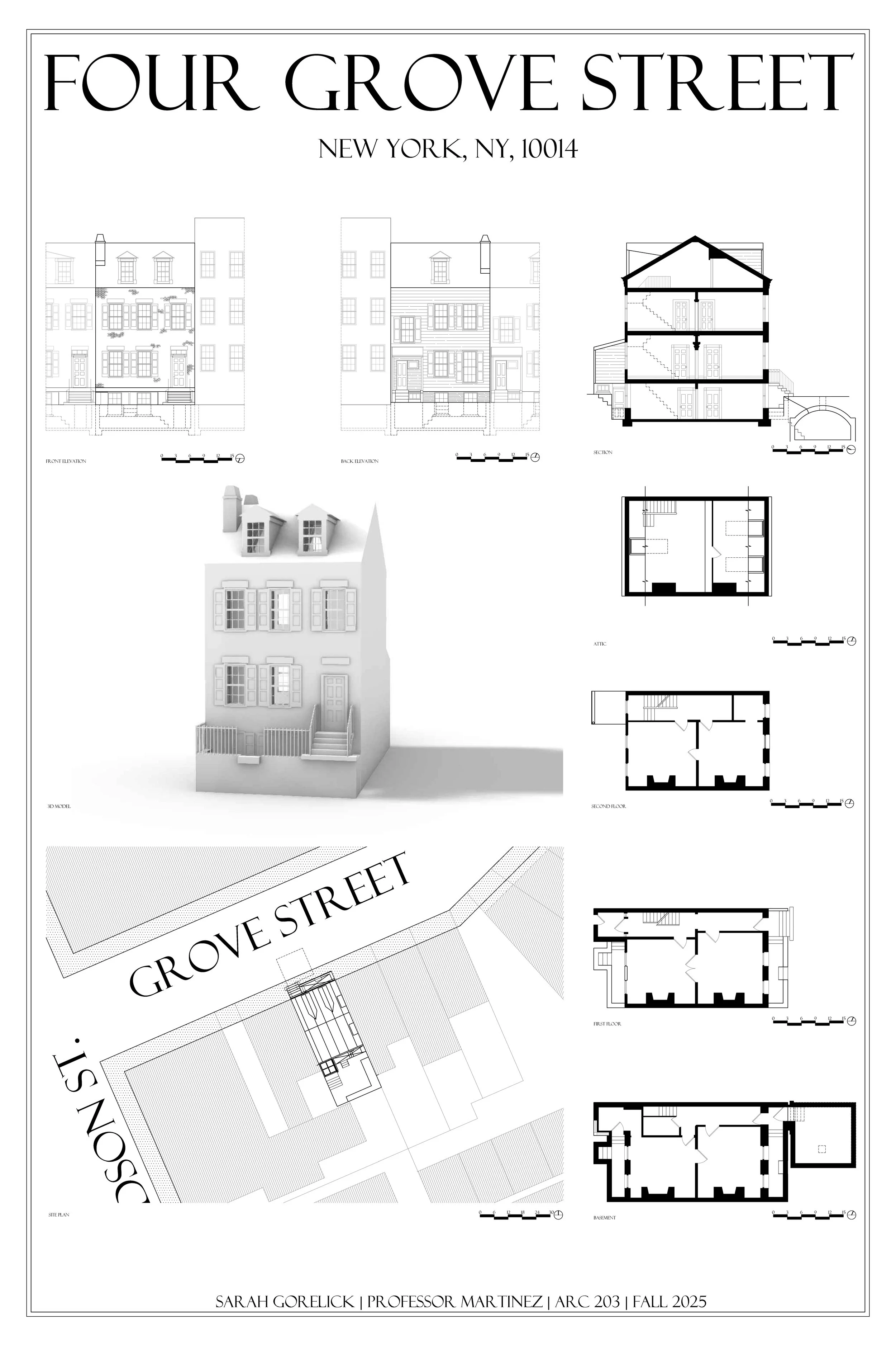 Beginning with the precedent of 4 Grove Street, I studied the geometry of the row house and determined what made it a successful plan. Then, I applied these lessons to a design of my own for a five-unit enclave on a 120’ x 120’ parcel. While the project retains the efficient spatial organization of the New York prototype, I reinterpreted the typology through a Mediterranean Classical lens to establish a distinct, regionally appropriate character.